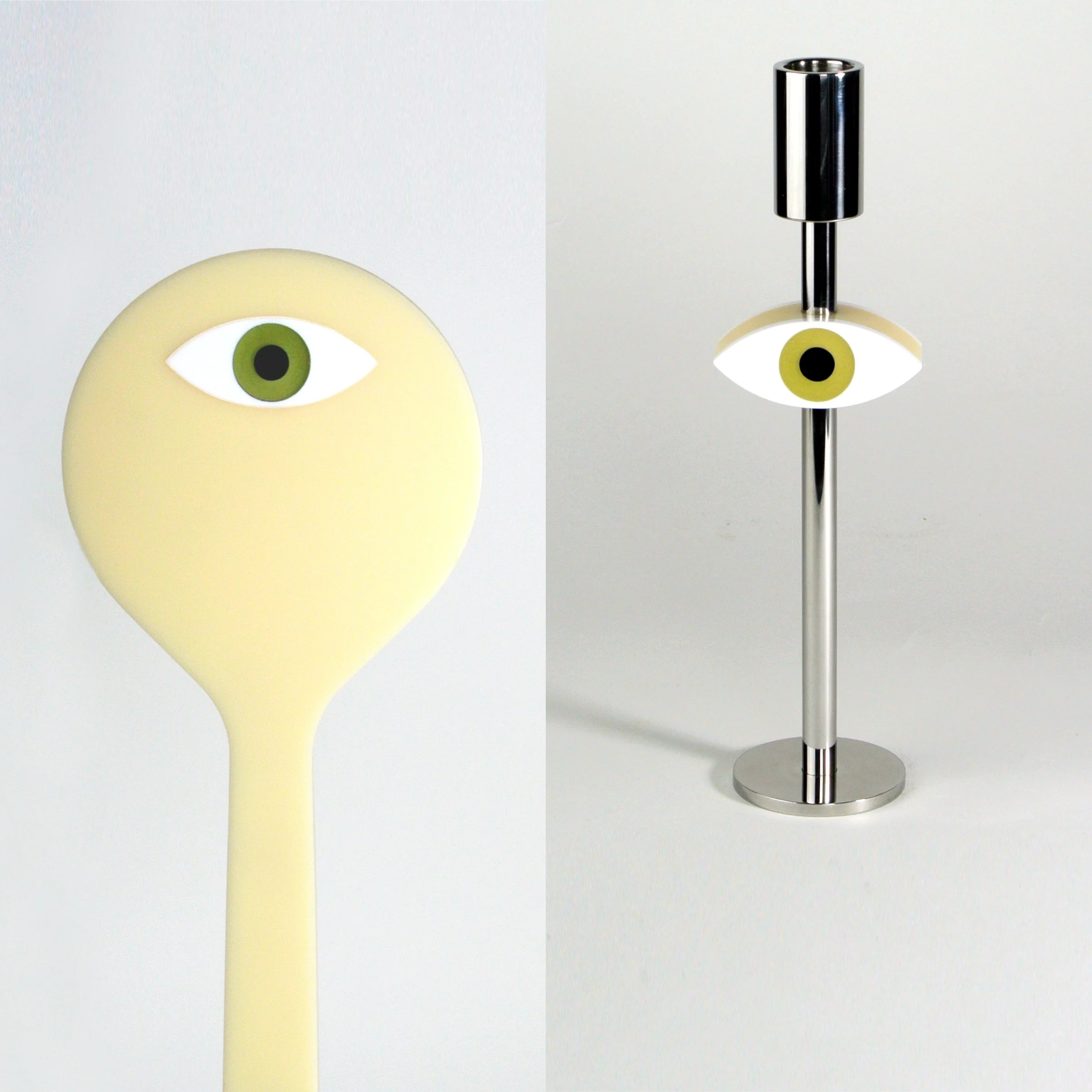 Eye Glass mirror. Useful object, acrylic, birch plywood, stainless steel, glass mirror. 32.5cm high. A very practical hand mirror that holds a powerful symbol and becomes a cyclopsian mask when used. A nod to Man Ray obviously. The mirror is sibling to the Eye Level candlestick so side-by-side they make a binocular pair.