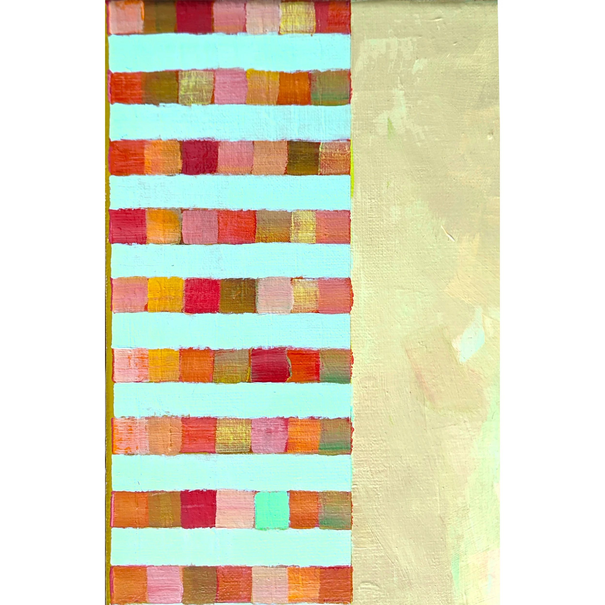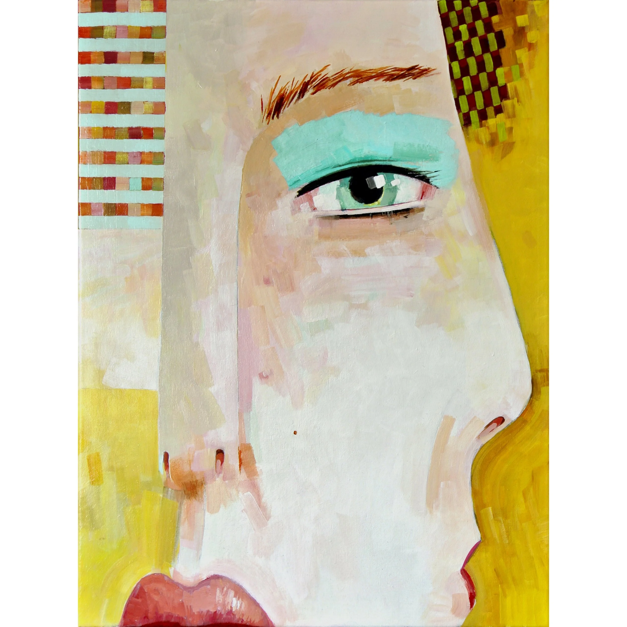 Long Face 1. Painting, acrylic on canvas 60 x 80cm. The first painting based on the Long Face Candlestick object where her face image is dominated by a single symmetrical eye, her mouth delineates the bottom edge of the picture and the paradox of two faces in one is maintained in a 2D space. There are ambiguous parts that relate to the pattern and weave in clothing and formalist abstract painting.