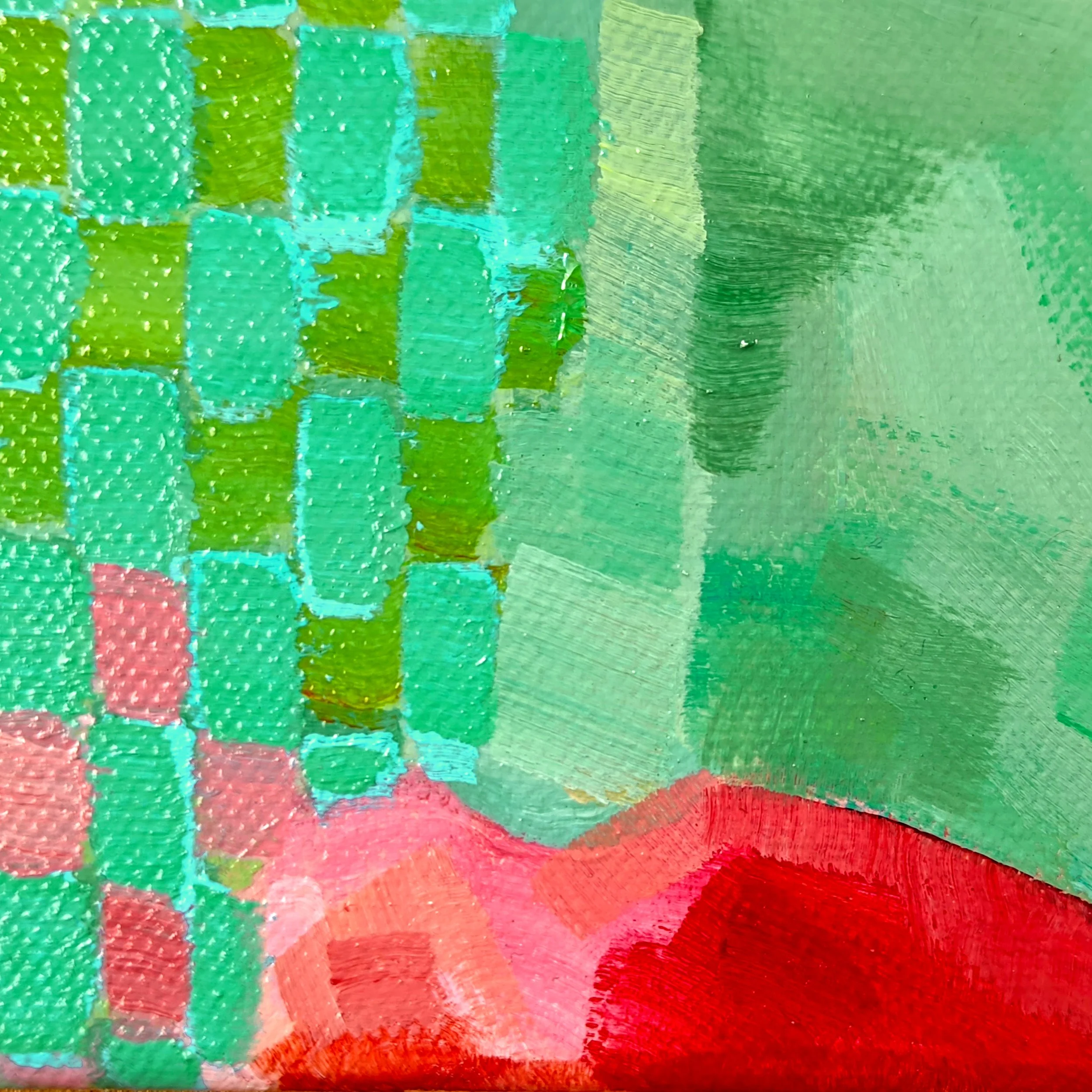 Long Face 3. Painting, acrylic on canvas with gold leaf detail 40 x 50cm. This is the third and final Long Face painting, the idea that started with the Long Face Candlestick In this one she is somehow a pyramid, dominated by a single symmetrical eye, obviously related to the one on US banknotes and to the mythological all-seeing eye. Her mouth has slid off to the bottom edge of the picture and she ‘wears’ the same earring with Long Face 2 (they share a pair). I’ve used gold leaf on the earring, placing decoration above representation so thank you Gustav Klimt.
