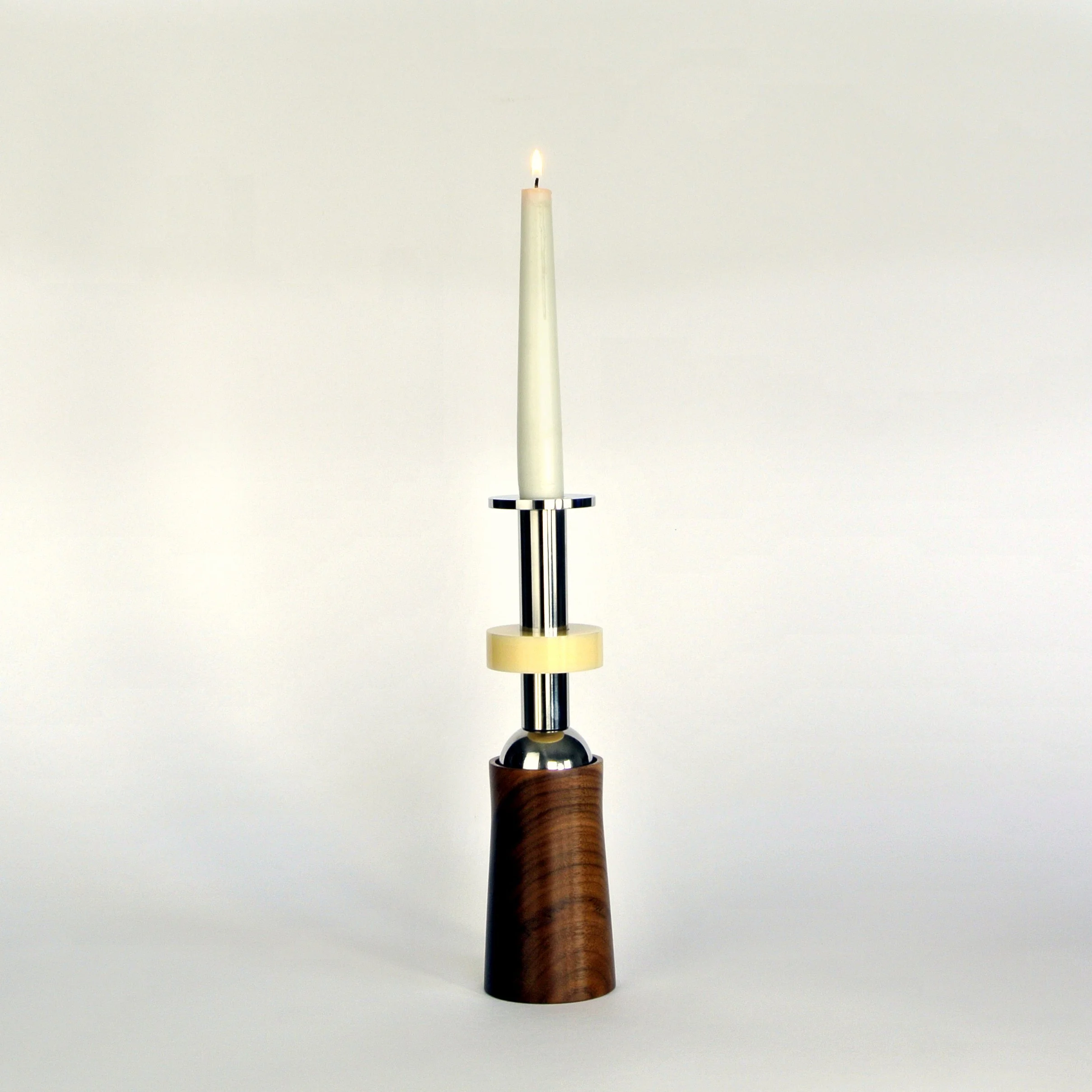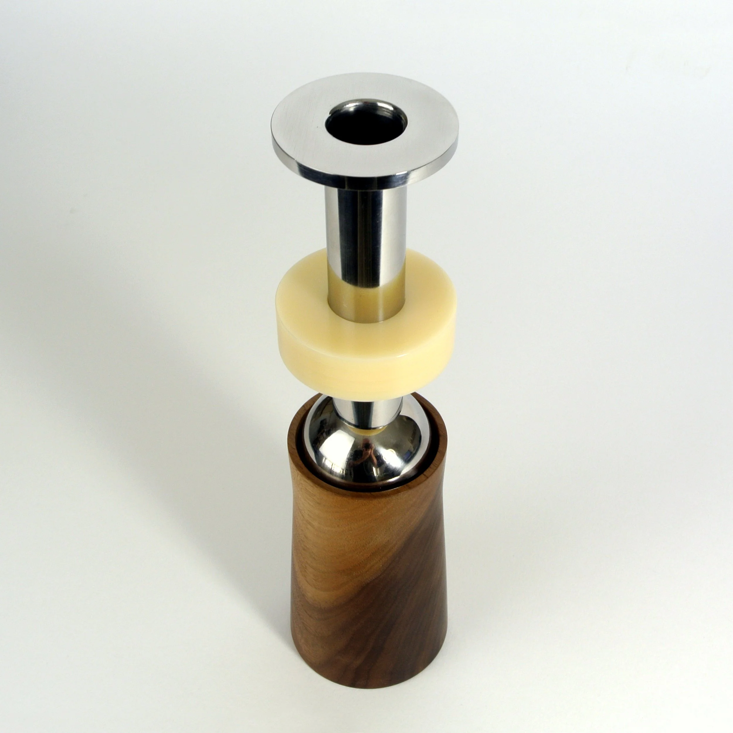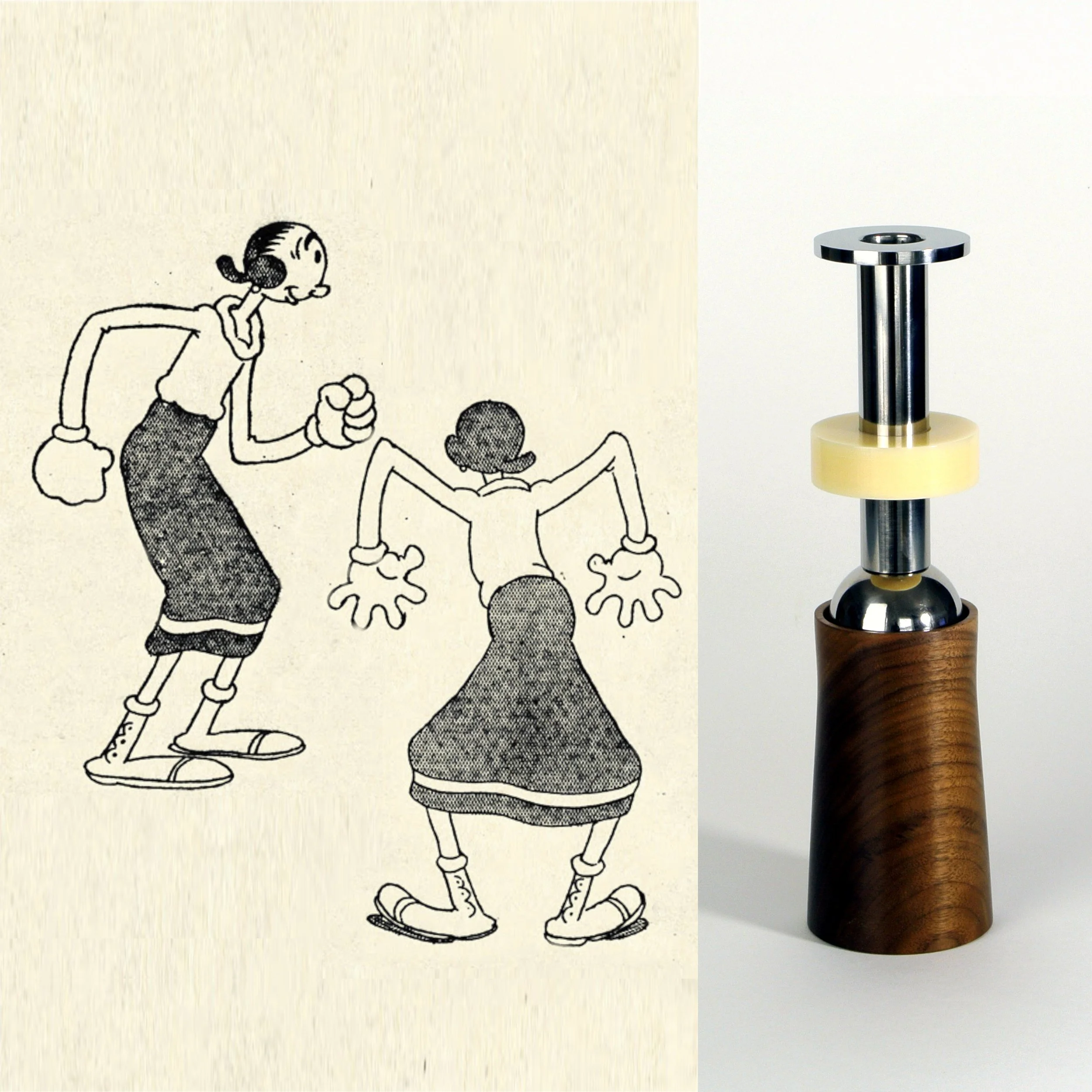 Oyle candlestick. Useful object, stainless steel, walnut hardwood, acrylic 26cm high. Only after it was made did I recognise it was Olive Oyle, cartoon girlfriend of Popeye. Look at the original character drawings and see if you agree.