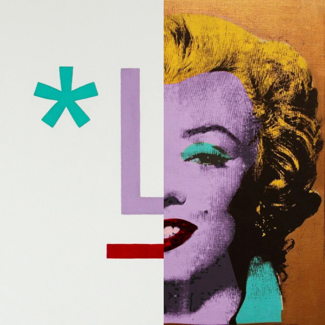 Self Portrait as a Warhol Marilyn. Print edition of 10, three-colours woodblock on paper 38 x 50cm. My very large typographical self portrait. The face symbol is made in Arial font: asterisk—capital L underlined—asterisk. The colours come from one of those legendary Andy Warhol images of Marilyn Monroe. The print is very physical: wood block characters impress deep in the paper laying down thick sticky ink.